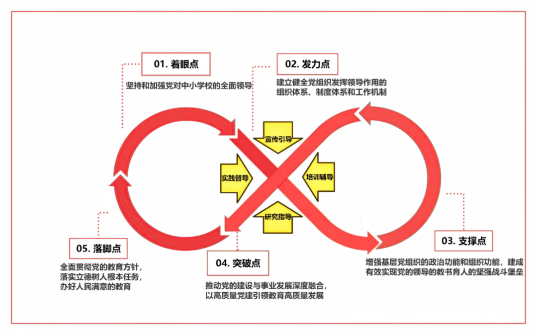 “五维赋能”彰显的是内容与效果,即:聚焦根本着眼点,坚持和加强党对中小学校的全面领导;把准首要发力点,建立健全党组织发挥领导作用的组织体系、制度体系和工作机制;夯实核心支撑点,增强基层党组织的政治功能和组织功能,建成有效实现党的领导的教书育人的坚强战斗堡垒;盯准关键突破点,推动党的建设与事业发展深度融合,以高质量党建引领教育高质量发展;站稳最终落脚点,全面贯彻党的教育方针,落实立德树人根本任务,办好人民满意的教育。