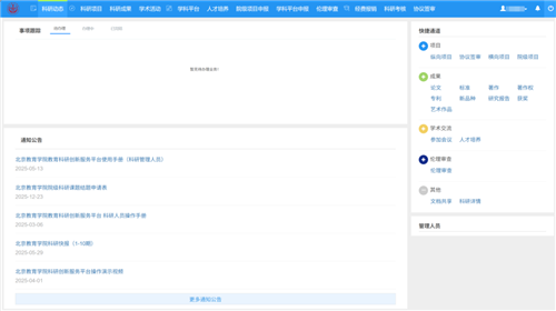 为实现科研成果量化管理,提升科研管理效能,学院于2022年申请建设科研创新服务平台,该平台已于2024年12月通过验收,2025年正式上线运行。平台全面支撑学院各项科研服务工作,为教职工提供科研项目(院级、纵向、横向课题)申报与管理、科研成果登记、学科创新平台维护、伦理审查办理等全流程服务及技术支持。“十四五”期间,平台高效完成全院科研立项项目数据迁移与信息完善工作,持续迭代功能模块、简化操作流程、提升系统稳定性。平台顺利通过北京市财政专项评审,充分体现了项目建设的规范性与实用性,为学院科研高质量发展筑牢基础。