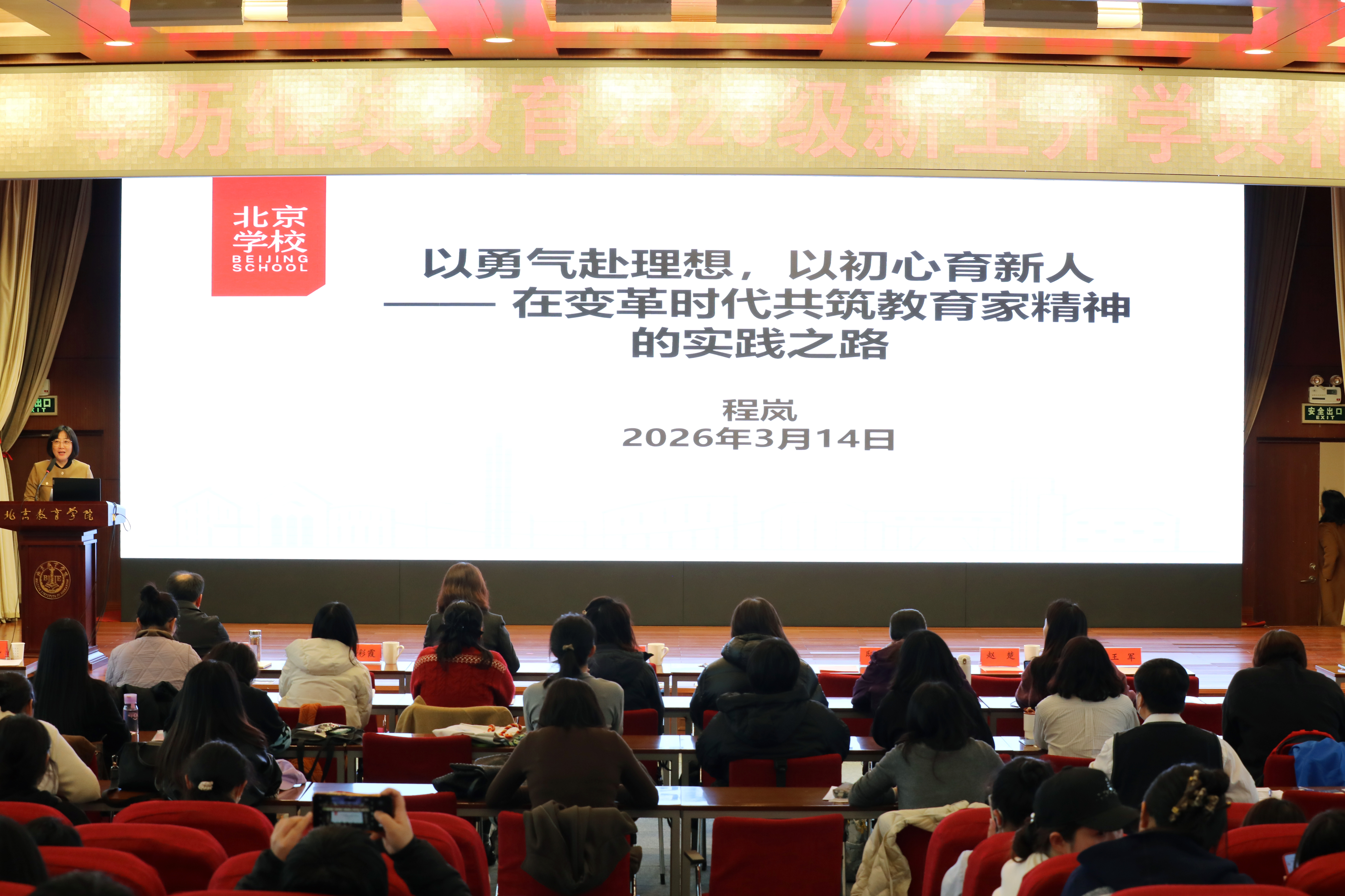 开学典礼后,北京学校副校长、特级教师、正高级教师程岚以“以勇气赴理想,以初心育新人——在变革时代共筑教育家精神的实践之路”为题,为全体新生讲授开学第一课。程岚校长结合自身丰富的一线教育实践,围绕“播下‘种子’、炼功筑‘干’、育心为‘养’、向光而行”四个维度,系统阐述教师如何在变革时代坚守初心、涵养精神、勇于实践,走出坚实的专业成长与育人之路。